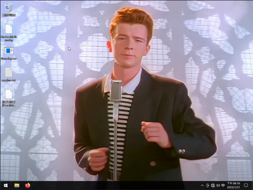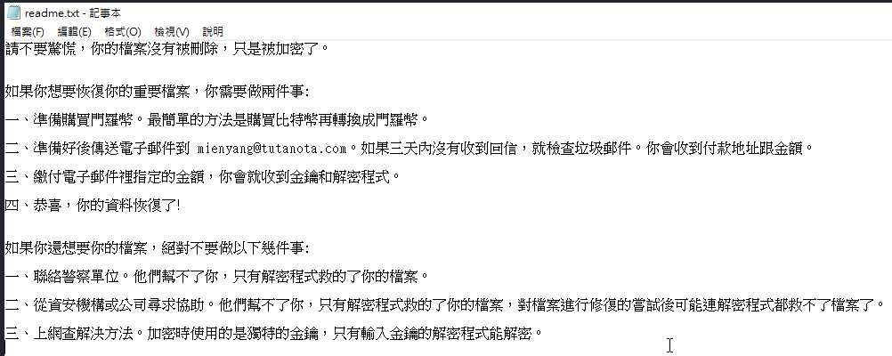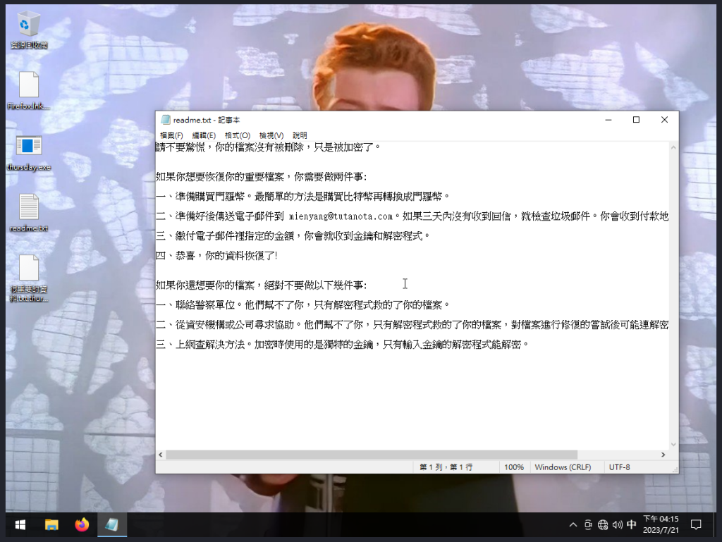 雖然我用的是十年前的 i3 ,但是是乾淨的系統,被加密的文件/圖片應該很少,所以點開 thursday.exe 後,執行只花了20秒,readme 就跳出來,背景也換掉了。購買的時候,是可以客製的,但是我沒有看過很多勒索軟體的勒索內容,所以除了給他我電子郵件(圖中mienyang…那個)以外,我只有要求把背景換成Never Gonna Give You Up,其他「指示」都是預設的。哈哈,沒想到看文章也能被 Rickroll 吧!