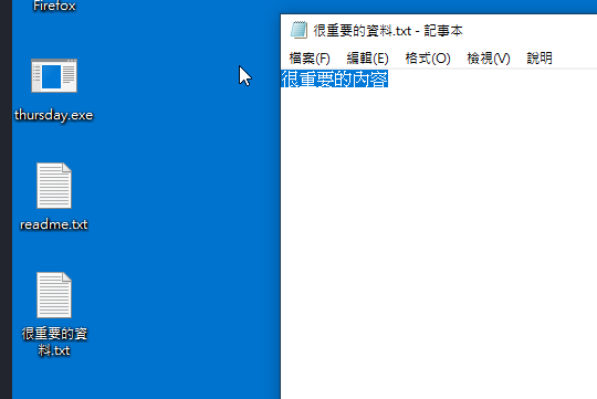勒索軟體是透過加密文件來勒索金錢,付錢之後才會解密(如果他還有點良心的話,有的時候不會),所以我在新增了一個一看就知道很重要的資料。