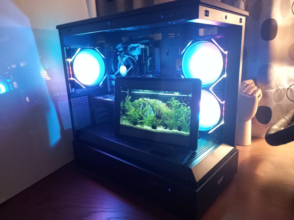 你肯定在好奇為什麼標題是魚缸? 最後附上一個小玩笑,因為兩片玻璃讓它看起來很像高級魚缸,所以我拿平板播放魚缸動畫拍了一張照片,但是這又讓我忍不住讚嘆這種設計的美。