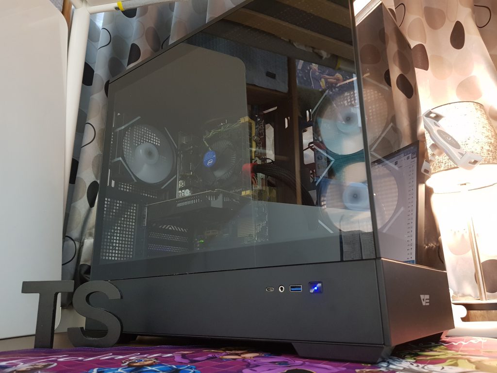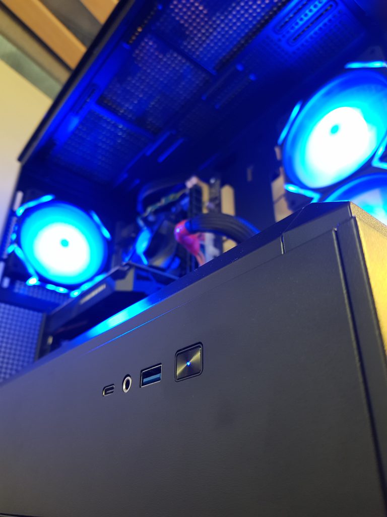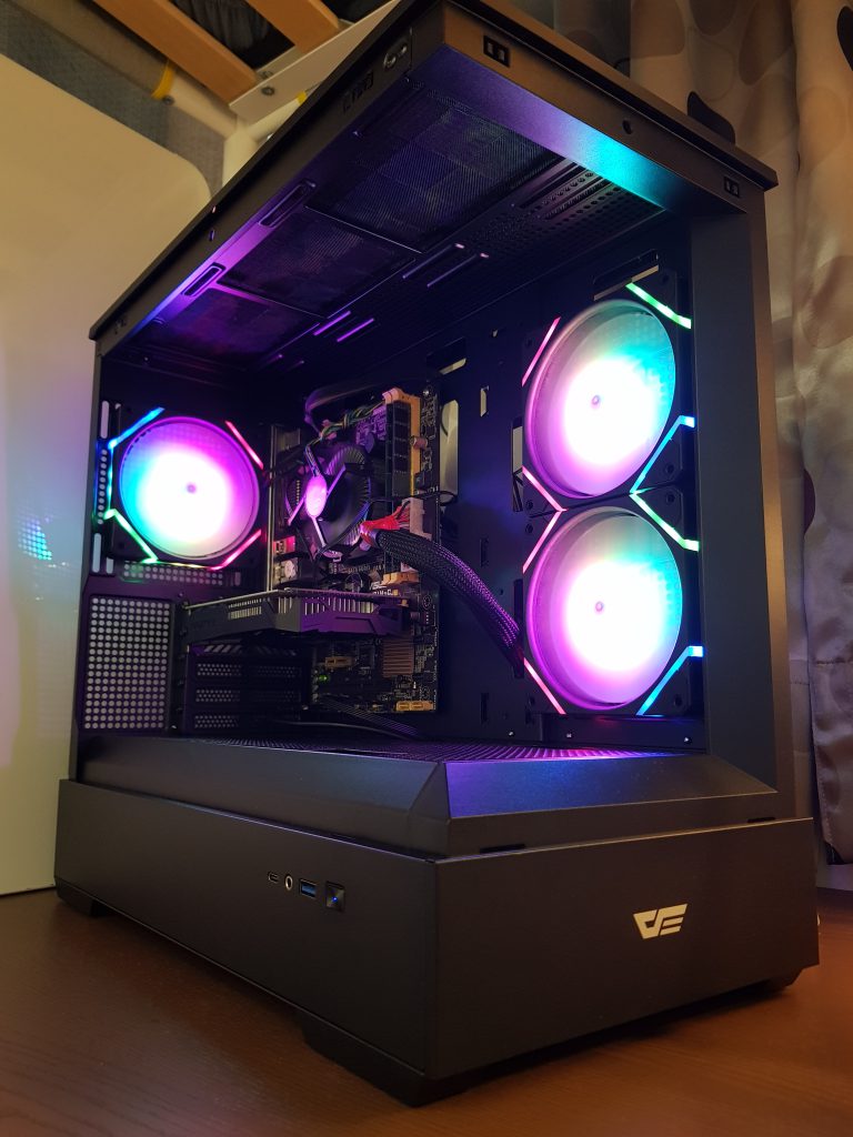 這次轉移過程相當順利,果然搬到新家後給人的感覺不像我那原本的老電腦。點燈後才發現,除了扇葉發光以外,四個角還有斜45度的燈光,呼應了前面提到的稜角設計,而且跟darkFlash的logo很搭。