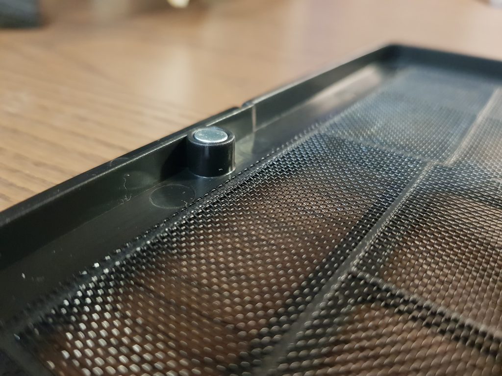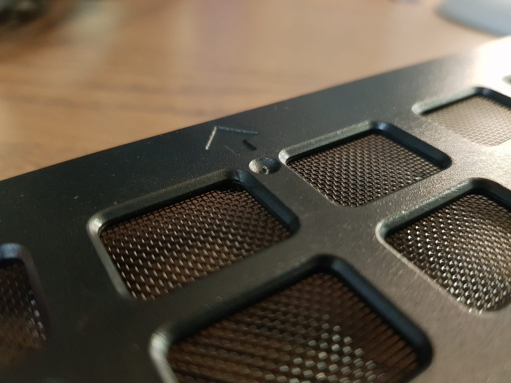 機殼下方的防塵網跟上面不一樣,是用強力磁鐵的。另外,外側有箭頭標示機殼前方。方向反了可是裝不上去的!